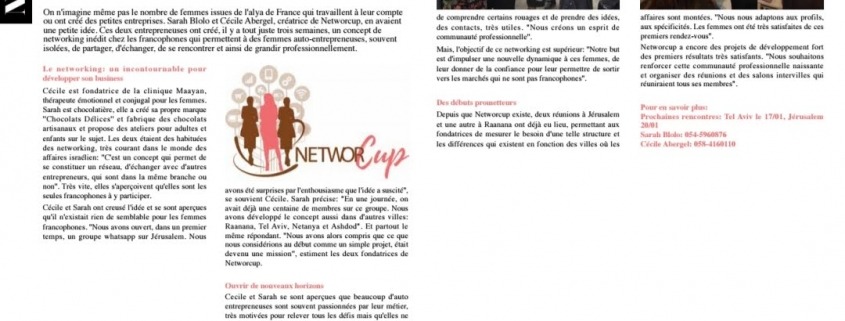 Depuis que NetworCup existe, deux réunions à Jérusalem et une autre à Raanana ont déjà eu lieu, permettant aux fondatrices de mesurer le besoin d’une telle structure et les différences qui existent en fonction des villes où les affaires sont montées. ”Nous nous adaptons aux profils, aux spécificités. Les femmes ont été très satisfaites de ces premiers rendez-vous”.